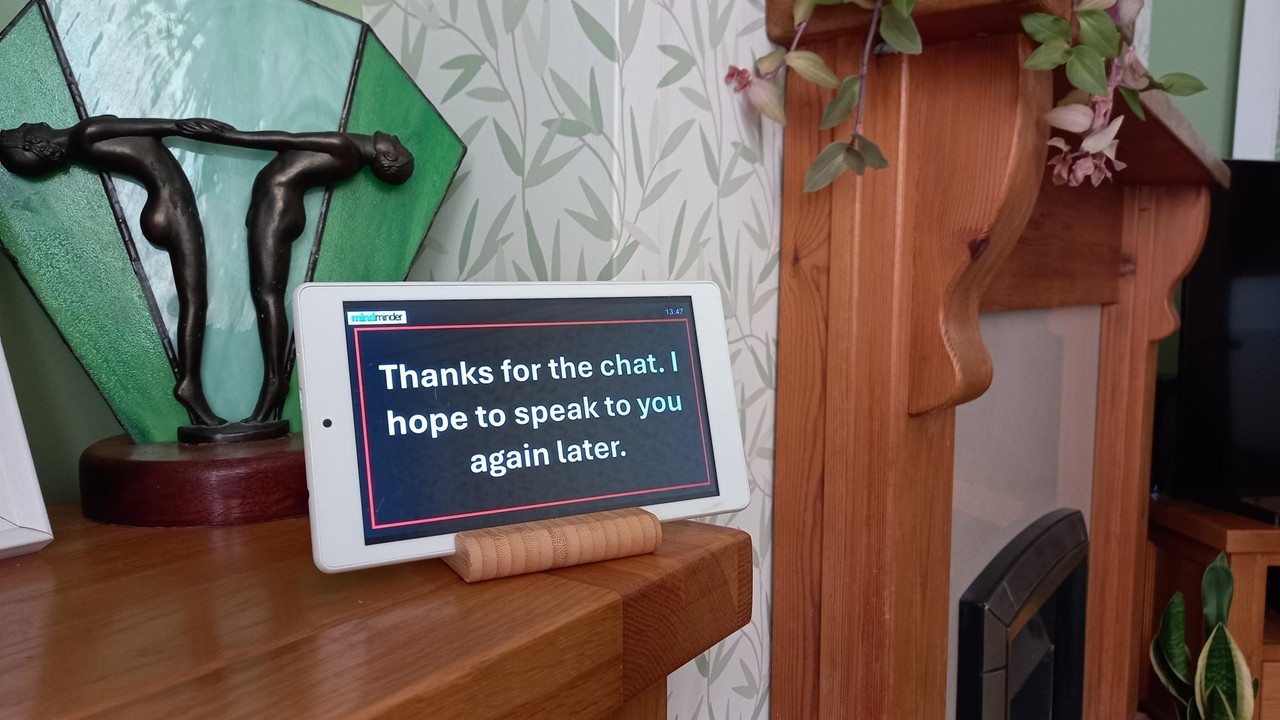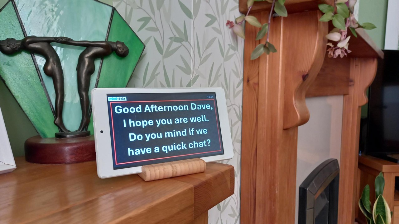 In normal operation, mindminder provides a customisable "clock" display to provide orientation of time of day, date and day of the week. However when scheduled by a Carer, dialogue starts; initially asking the User if a conversation is convenient, and then discussing elements customised on a per-conversation basis.