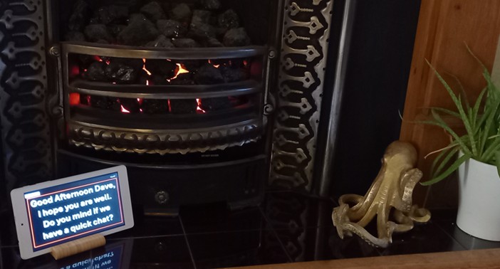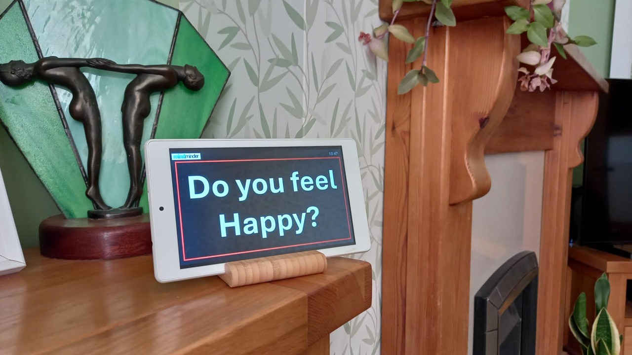 In normal operation, mindminder provides a customisable "clock" display to provide orientation of time of day, date and day of the week. However when scheduled by a Carer, dialogue starts; initially asking the User if a conversation is convenient, and then discussing elements customised on a per-conversation basis.