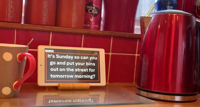 For example in the morning a User may be simply reminded to make sure the curtains have been opened, later in the morning a check that the user has had breakfast and prompted to have a drink to stay hydrated, mid-afternoon a check on mood, and later to take medication before bed and to close the curtains again. More explicit tasks such as timely preparation for an appointment, putting out and recovering the bins on bin-day, remembering to call a friend or relative periodically can all be customised by Carers and enabled/disabled in real-time as required..